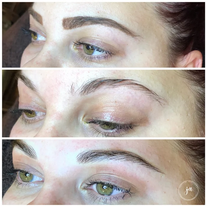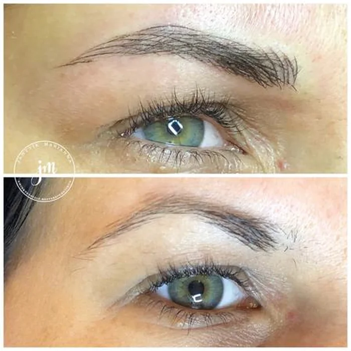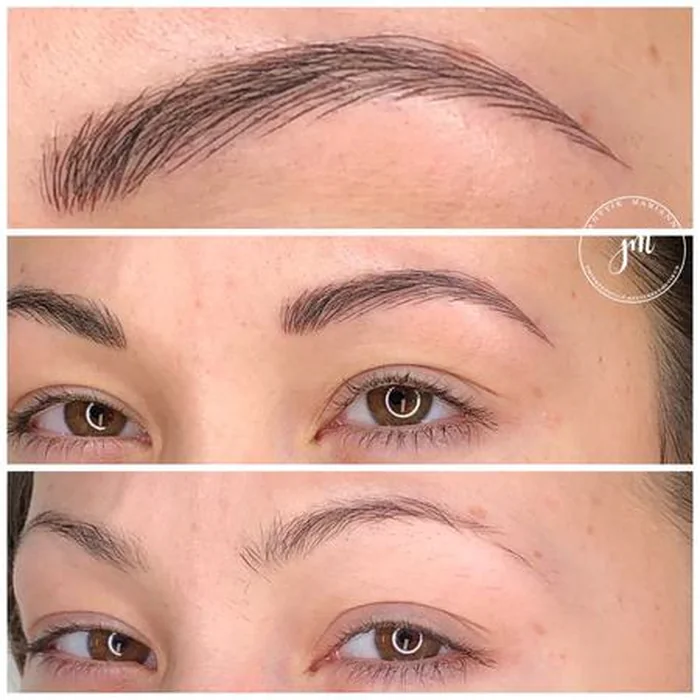 Szálas szemöldöktetoválás: ennél a technikánál apró, természetes ívű szőrszálakat rajzolunk a szemöldök ívének megfelelően. Ezzel a módszerrel érjük el a legtermészetesebb és legplasztikusabb hatást, hiszen a rajzolt szálak beleolvadnak a természetes szőrzetbe. Függően a vendég adottságaitól dolgozhatunk több színnel is egy szemöldökön, így árnyalva azt. Microblading technikánál a tetoválást egy micropengével, azaz valójában egy vékony tűsorral végzem, ezzel karcolgatom a szálacskákat a bőrbe.