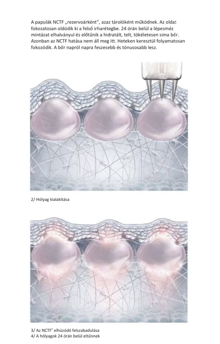 A hialuronsavat és több, mint 50 bőrmegújító összetevőt tartalmazó anyag pontosan és egységesen, fájdalom nélkül jut a megfelelő helyre.